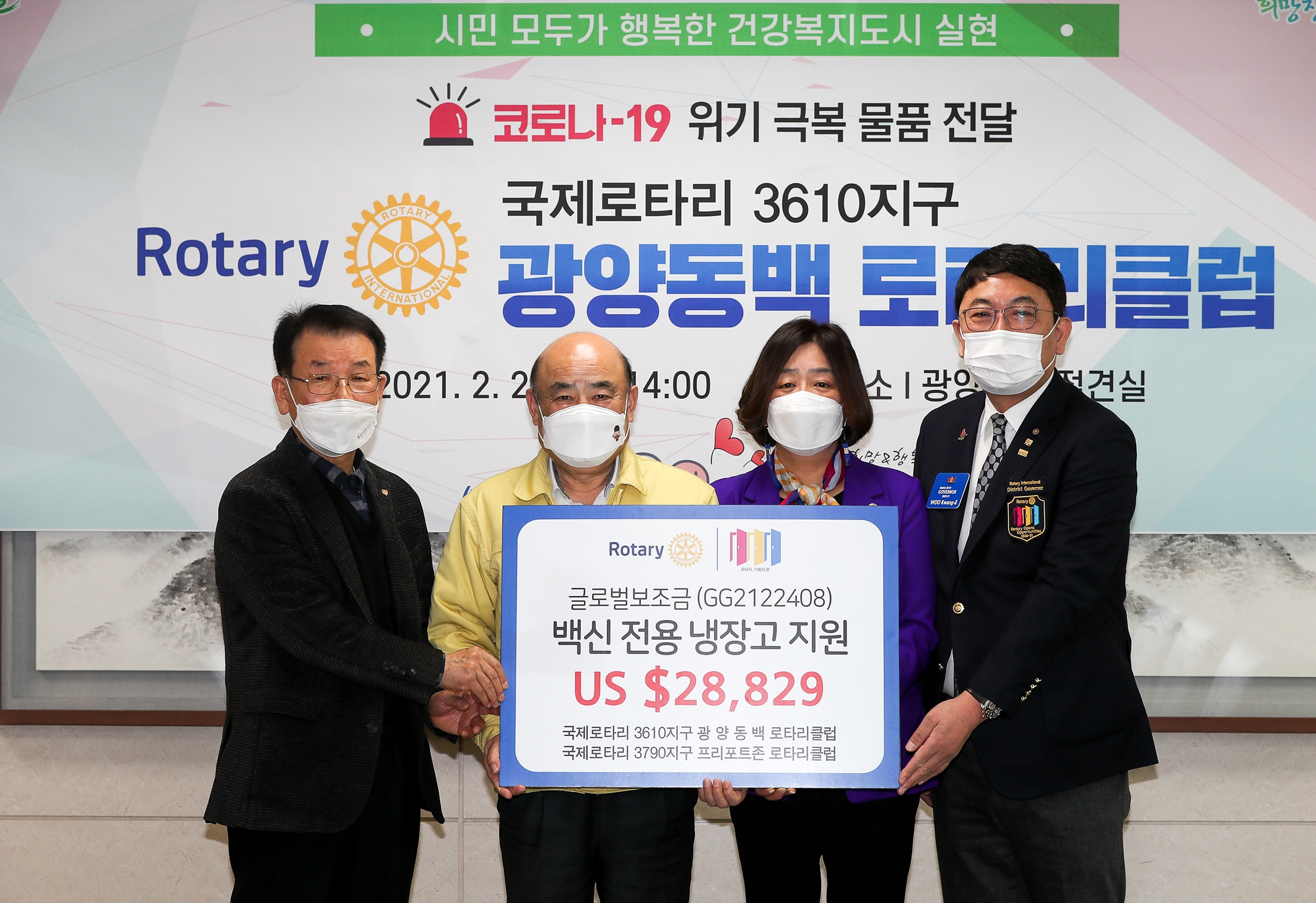 광양동백 로타리클럽은 안전한 백신 보관과 예방접종으로 코로나19 확산을 방지하고 광양시민의 건강을 보호하고자 국제로타리 3610지구 글로벌 보조사업 공모에 선정돼 사업을 추진했다.