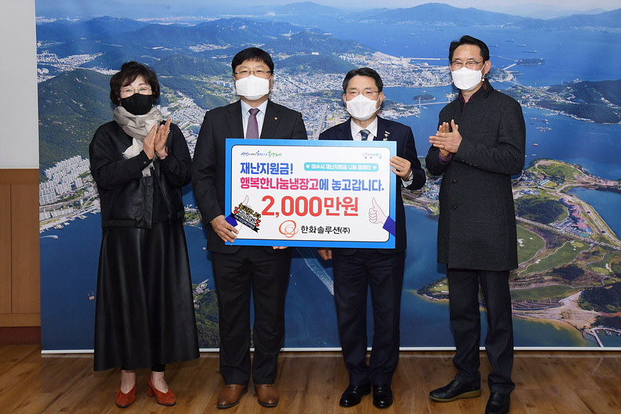 한화솔루션(주) 안인수 전무는 지난 24일 여수시청을 찾아 임직원들이 재난지원금 수령액 중 일부를 모금해 마련한 2천만 원의 기부증서를 ‘행복한 나눔냉장고’ 사업을 위해 써달라며 권오봉 여수시장에게 전달했다.