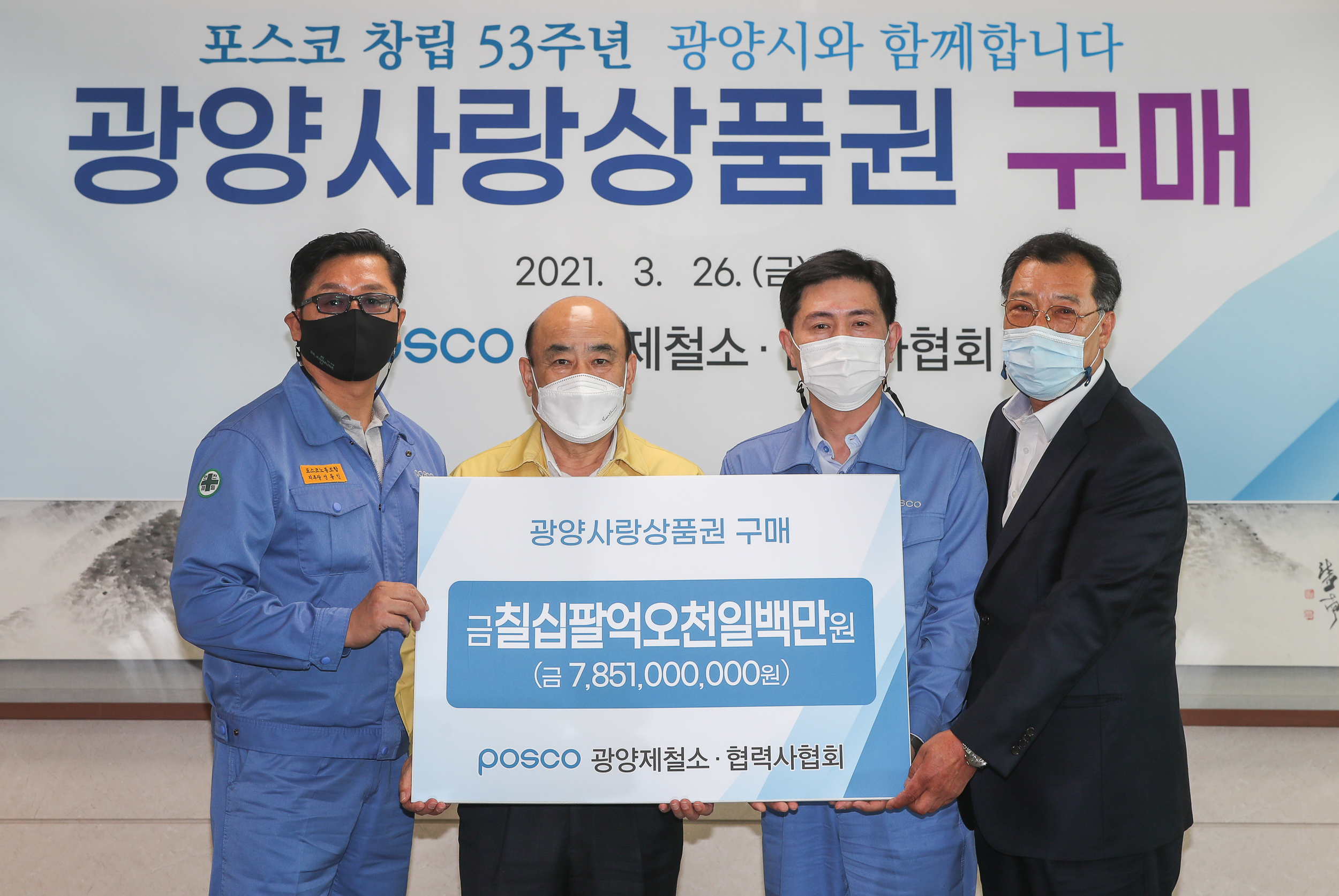 광양시가 포스코 광양제철소·협력사협회와 326일 광양시장 접견실에서 785천만 원 상당의 광양사랑상품권 구매 약정식을 가졌다.