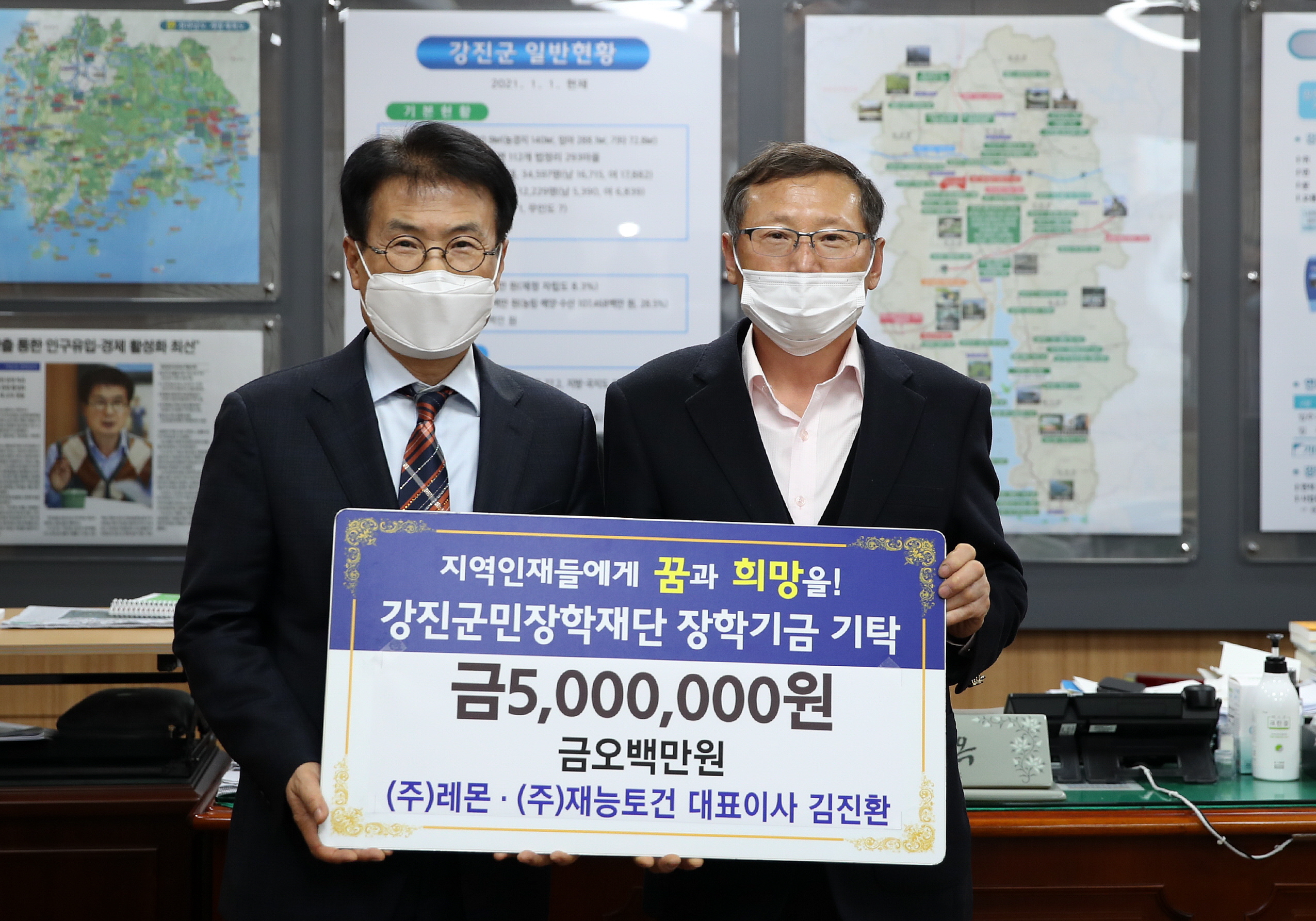 지난 4일 ㈜레몬‧(주)재능토건의 김진환 대표이사가 500만 원의 장학금을 강진군민장학재단(이사장 이승옥)에 쾌척했다 김진환 대표이사는 시설물유지관리업체인 ㈜레몬과 철근‧콘크리트공사업체인 ㈜재능토건을 운영 중이며 2008년부터 총 7회에 걸쳐 지금까지 1,600만 원의 장학금을 강진군민장학재단에 기탁했다.김진환 대표이사는 “어렸을 때 집안형편이 어려워 학업을 이어나가기 힘들었는데 성인이 된 후 만학으로 학업의 꿈을 펼칠 수 있었다.”며 “지역 저소득층 학생들이 경제적인 부담 때문에 학업을 중단하는 일이 없기 바라는 마음으로 장학금을 기탁했다.”고 전했다.이승옥 이사장은 “지역 인재 양성을 위해 장학금을 기탁해주신 김진환 대표이사님께 감사드리며, 기탁해주신 장학금은 지역 인재 육성을 위한 다양한 교육 및 장학 사업에 사용하겠다.”고 밝혔다 강진군민장학재단은 올해 들어 1억 1,271만 원의 장학기금이 기탁되었으며 지금까지 170억 5,700만 원의 장학기금이 조성되었다. 장학재단은 자발적인 기부문화를 확산하고 더 많은 학생에게 장학금을 지급할 수 있도록‘1인 1계좌(5천원) 갖기 운동’을 추진하고 있으며, 자동이체(농협 254-01-004015, 광주은행 625-107-309199, 신협 131-005-631005, 산림조합 612-11-0004950, 새마을금고 2823-09-008254-2, 우체국 500165-05-000764 강진군민장학재단)로 신청하면 된다.