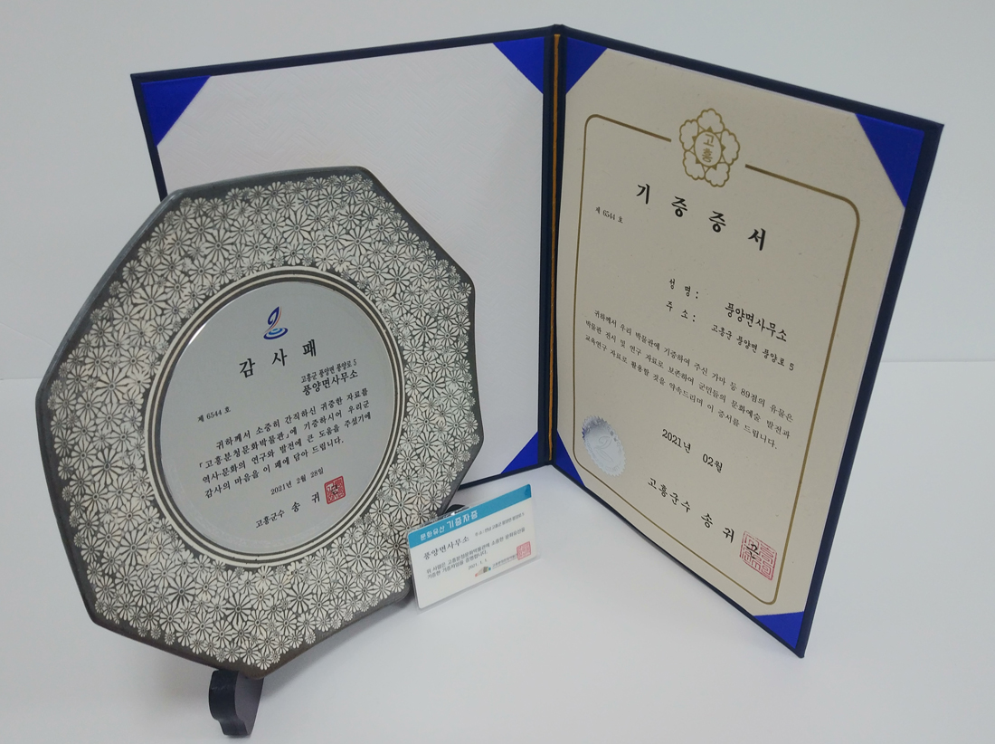 고흥군(군수 송귀근) 분청문화박물관은 유구한 고흥의 역사와 문화를 기록·보존하고자 전 국민을 대상으로 문화재 기증운동을 전개하였고, 2020년 한 해 동안 기증해주신 기증자 분께 감사의 마음을 담아 기증증서와 감사패를 전달했다고 밝혔다.