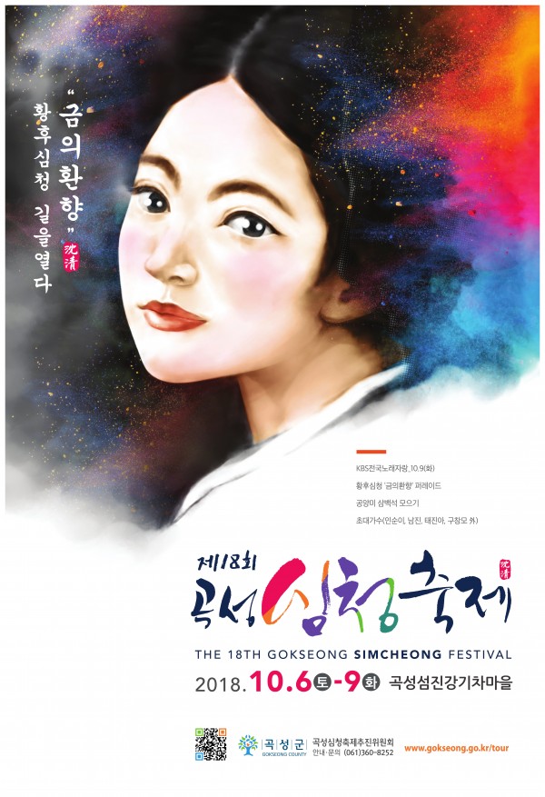 제18회 곡성 심청축제 임보환 편집인 multiis… 0 294 2018.09.06 12:07 제18회 곡성 심청 축제가 곡성군 기차 마을 장미 공원에서 열립니다재향 향우회 여러분과 곡성을 찾으시는 관광객 여러분 들께 진심으로 환영합니다 곡성의 섬진강가 가 보이는 곳에서 의 1박2일 관광 즐기세요페러글라이딩 과 곡성 명품관 에서 의 불고기 식사도 괜찮습니다재래시장의 인심 좋은 농산물 많이 많이 사 가세요<< 축제기간 2018.10.6.-9일 까지 >