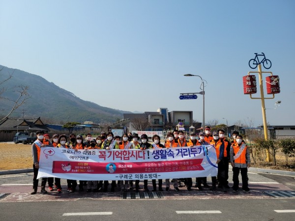 전남 구례군 간전면 남ㆍ여의용소방대(대장 김동화ㆍ하연수)가 코로나19 확산 방지를 위해 간전면 회차로에서 코로나19 감염 예방 캠페인 활동에 온 힘을 쏟고 있다.