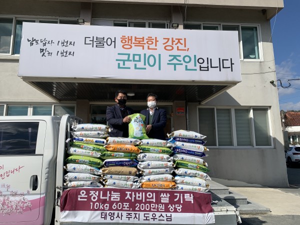 따뜻한 봄바람과 함께 강진군 군동면사무소에 따뜻한 자비의 손길이 전해졌다. 지난 2일 대한불교조계종 태영사(주지 도우)에서 우리 주변의 어려운 이웃을 위해 사용해 달라며 군동면사무소에 백미 10kg 60포를 기탁했다.