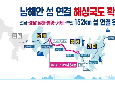도로과055-211-572325.07.10“남해안 해상국도 밑그림 완성...동북아 해양관광 중심지로”-지난9일,국토부 국도5호선 통영~남해43㎞기점 연장 발표-경남도정 역점사업‘남해안 섬 연결 해상국도’확정 쾌거-박…